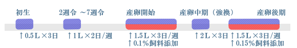 ![]() [ POINT] 出生後からの強い雛生産へ 疾病リスクの高まる1週令から4週令までの間の間欠利用がお勧めです。 季節変動(ヒートストレス)等のリスク低減にも活用下さい。 |