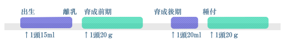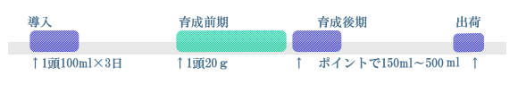 ![]() [POINT] 導入直後は嗜好性の高いABP液を用いた餌付けが効率的です。 育成期間中の整腸にABPエースを常時添加する事で生産性の向上が期待されます。 |